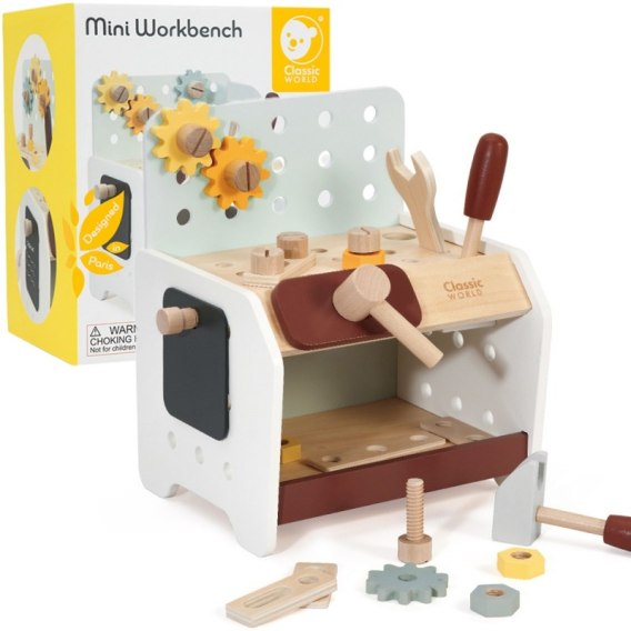 Drewniany stół warsztatowy od markiClassic World zapewni wspaniałą zabawę każdemu małemu majsterkowiczowi. Dzięki wielu narzędziom w zestawie, zabawa w majsterkowanie wspomoże rozwój zdolności manualnych, zaciekawi i rozpali dziecięcą wyobraźnię. Od teraz każdy maluch będzie miał okazje doskonalić swoją kreatywność gdyż zestaw zawiera wszystko co mu potrzebne do reperowania, wkręcania, wbijania gwoździ i wszelkich innych prac remontowych. Zestaw został wykonany z wysokiej jakości drewna, nie zawiera ostrych krawędzi, dzięki czemu jest bezpieczny dla dzieci i środowiska.